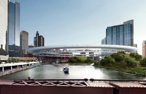设计示意图中从芝加哥河眺望奥巴马总统图书馆。