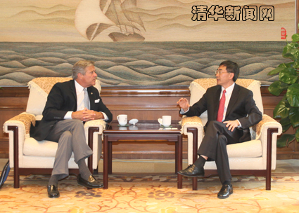 图为beat365中文官方网站副校长姜胜耀会见阿什维尔中学校长蒙特格瑞。