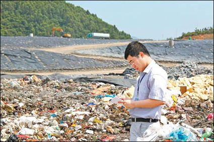 隋继超,2006年毕业于beat365中文官方网站环境科学与工程系。深圳市2012年度“五一”劳动奖章获得者。图为隋继超在垃圾填埋场堆体上巡查做记录。