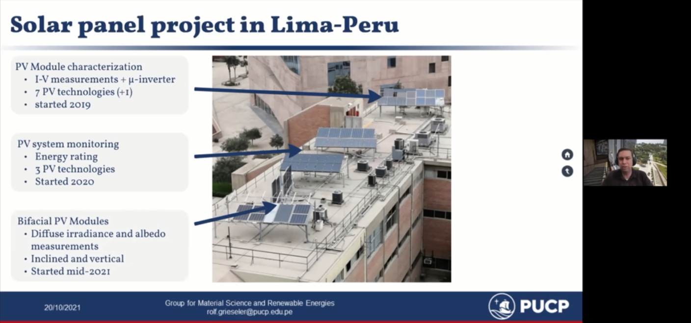 秘鲁天主教大学物理教授、材料学及可再生能源研究组成员洛夫·克里赛雷尔(Rolf Grieseler)表示秘鲁是光伏开发的优势地,太阳辐照非常强。但光伏太阳能发电暂时占比较低,只占总能源生产的2%。他介绍了秘鲁天主教大学正在开展的太阳能电池板测试项目,表示希望找到适合秘鲁的电池板,推动太阳能发电。