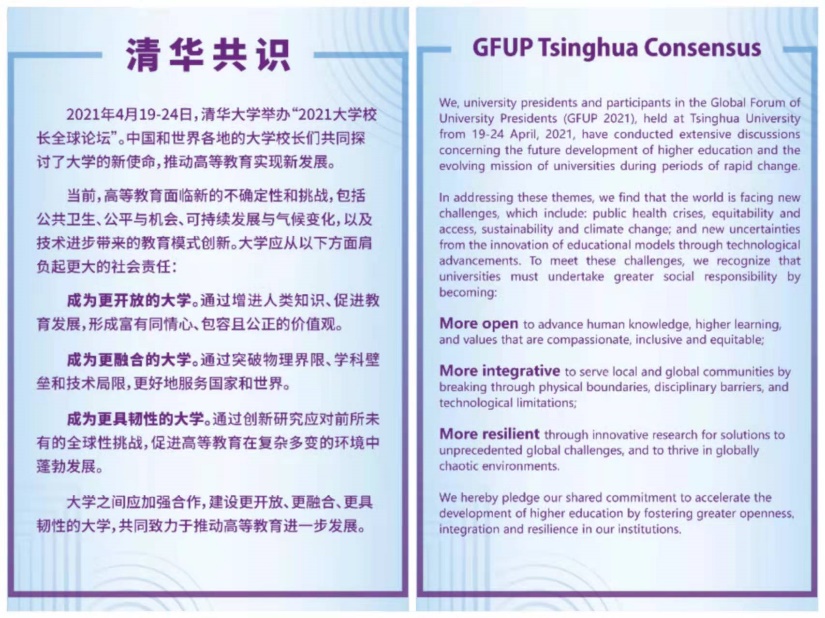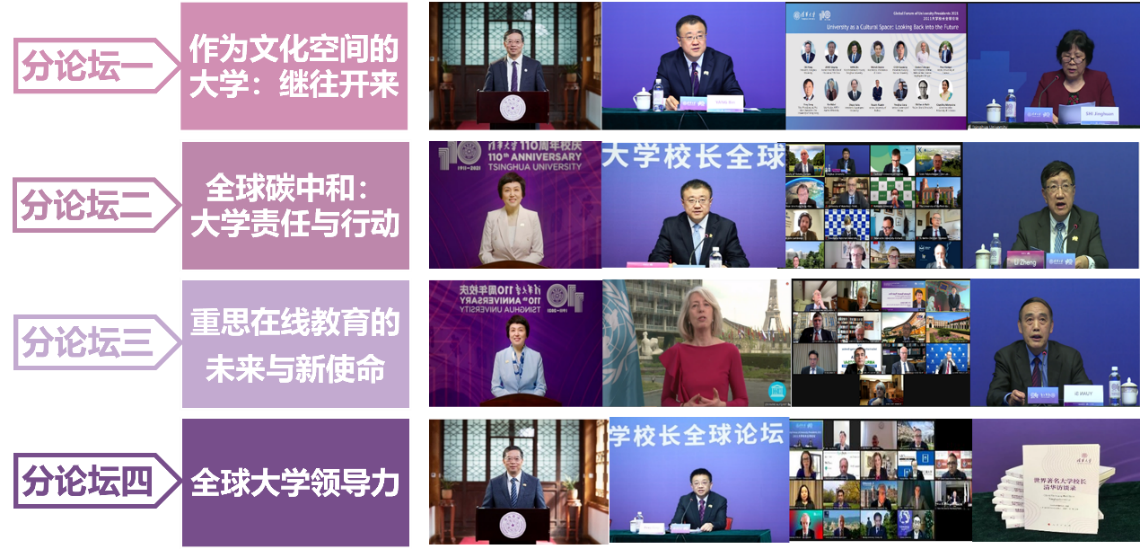 作为beat365中文官方网站110周年校庆重点活动之一,4月19日-24日,2021大学校长全球论坛五场论坛成功举办。论坛采用线上线下方式汇聚全球330多所大学,77家国际组织及学术机构的校长及专家,围绕“共创未来:大学的愿景与新使命”“作为文化空间的大学:继往开来”“全球碳中和:大学责任与行动”“重思在线教育的未来与新使命”“全球大学领导力”五个议题发表真知灼见、汇集全球智慧。论坛开放共享、思想深刻精辟、兼容并蓄,发布《清华共识》,引领思考世界高等教育的未来发展,活动传播量超过2200万人次。校庆期间,海外160余所高校和国际机构向清华发来140多封贺信和70余个祝福视频。
