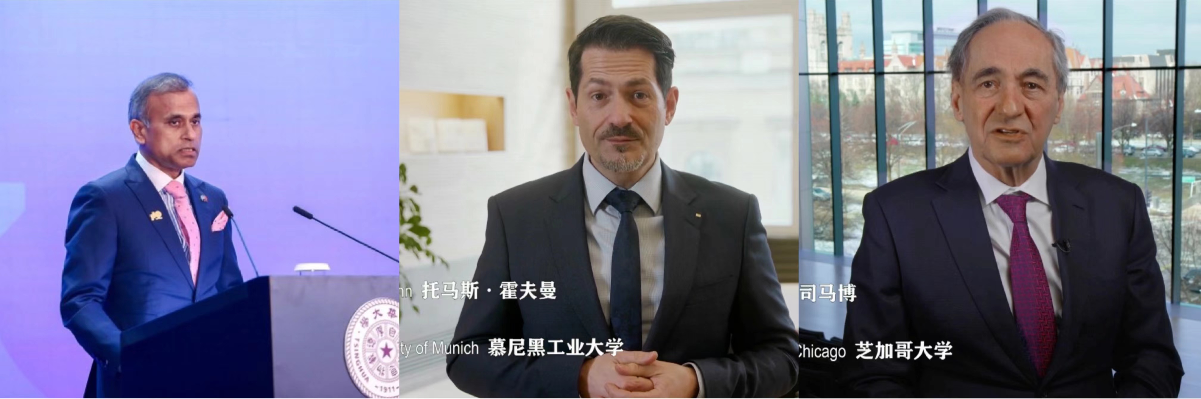 联合国驻华协调员常启德宣读联合国秘书长安东尼奥·古特雷斯为大会发来的贺信;慕尼黑工业大学校长托马斯·霍夫曼视频发言;芝加哥大学校长司马博视频发言(从左至右)