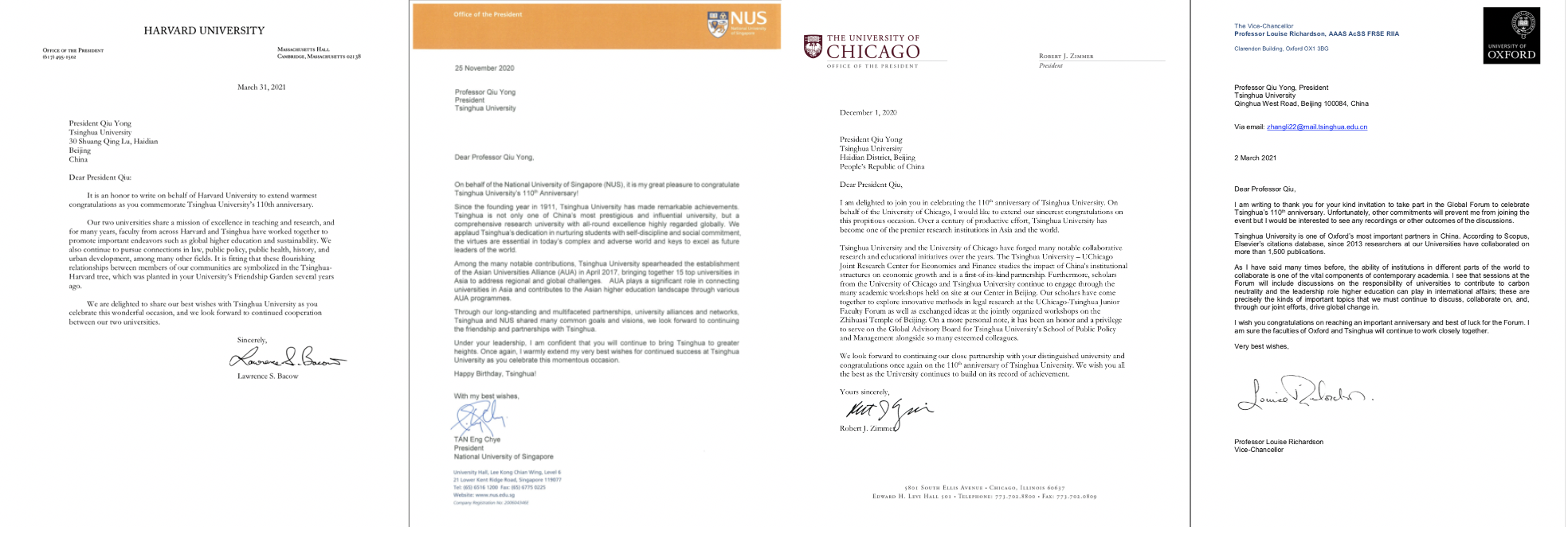 哈佛大学、新加坡国立大学、芝加哥大学、牛津大学校庆贺信(从左至右)