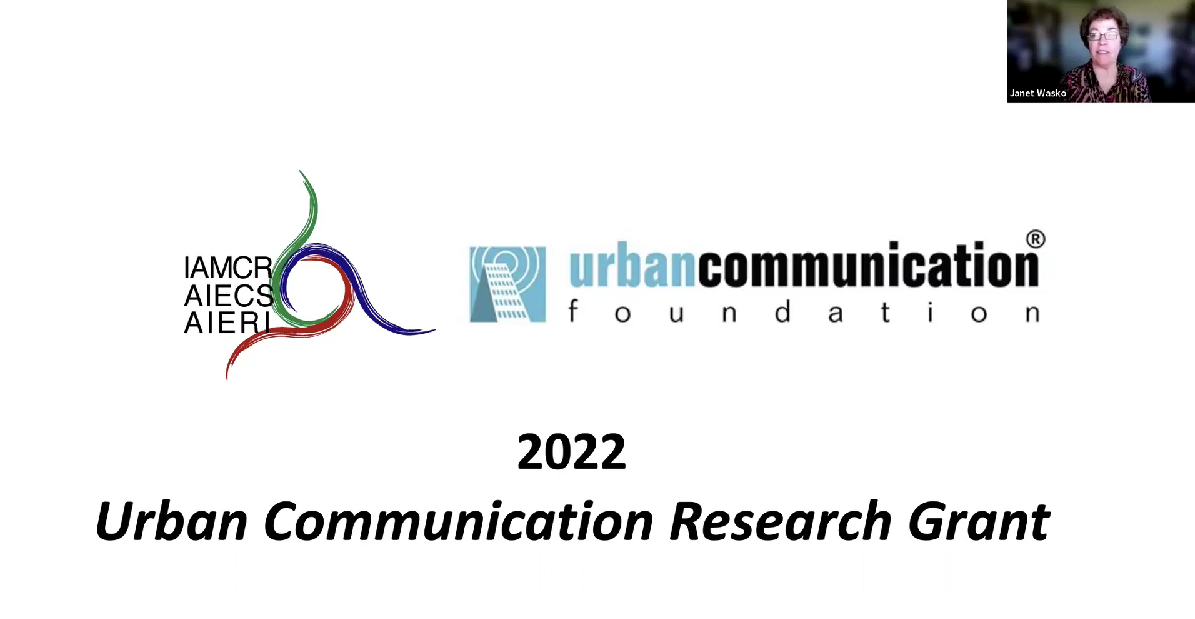 IAMCR城市传播研究基金奖委员会主席珍妮·瓦斯科向印度新德里古鲁·戈宾德·辛格·因德拉普拉萨大学(Guru Gobind Singh Indraprastha University)的Kulvveen Trehan与DiShaa Medhavi授予2022年度“城市传播研究基金奖”。该奖项于2013年设立,旨在鼓励对城市传播复杂环境的研究。本次获奖的研究项目为“展现印度新德里城市贫民预防、应对新冠的街头艺术:针对青年志愿团体Nehru Yuva Kendra Sangathan的个案研究”。评奖委员会认为该项目将街头艺术与城市传播相联系,有望为城市传播领域和制定城市政策作出重要贡献。