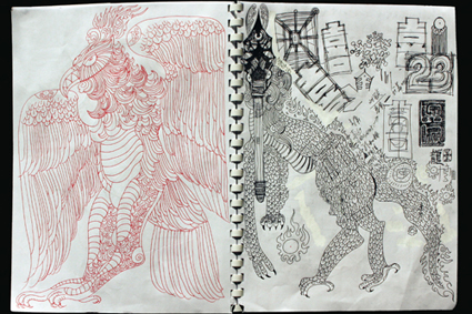 陈楠还非常提倡随时记录,不管是自己的灵感还是各种设计元素。在课堂上,陈楠会给学生们展示他在平时积累的设计素材,一般是按照主题来梳理,往往是一些生活中常见的图形和元素,比如各式文字,或是街头的信笔涂鸦,或是小广告,凡是他觉得有趣的,他都会小心地将其记录,而后纳入素材库中。甚而,他将这些素材一一划分,辅之以解说并加以呈现。每次课程结束后,课上的同学都会收到陈楠自制的素描本,他习惯于一刻不停地写写画画,也希望学生们能养成这样的习惯,他的学生常觉得收获颇丰。