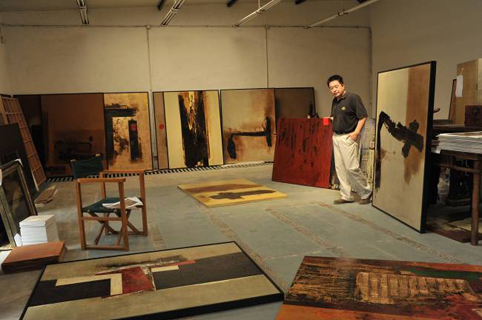 在这看似 “坦途”之中,程向君在艺术道路上付出的艰辛有几人知!在漆与画之间,他经历了怎样的纠结与波折,走出一条自己的漆画艺术之路,构建了通向心灵的巴别塔?近日,“心灵的巴别塔——程向君绘画作品巡回展”先后在河南省美术馆、福建省美术馆举行,使笔者有机会面对面采访程老师。敲开程向君工作室的大门,未曾想站在眼前的是一位白面素净、衣着简朴、笑容微敛的老师,工作室也是整洁、简单,除了桌上的画具、材料,堆放的作品,一台电脑,不多一分装饰,在这个安静的环境中,我们茶聊起程向君的漆画那些事儿。