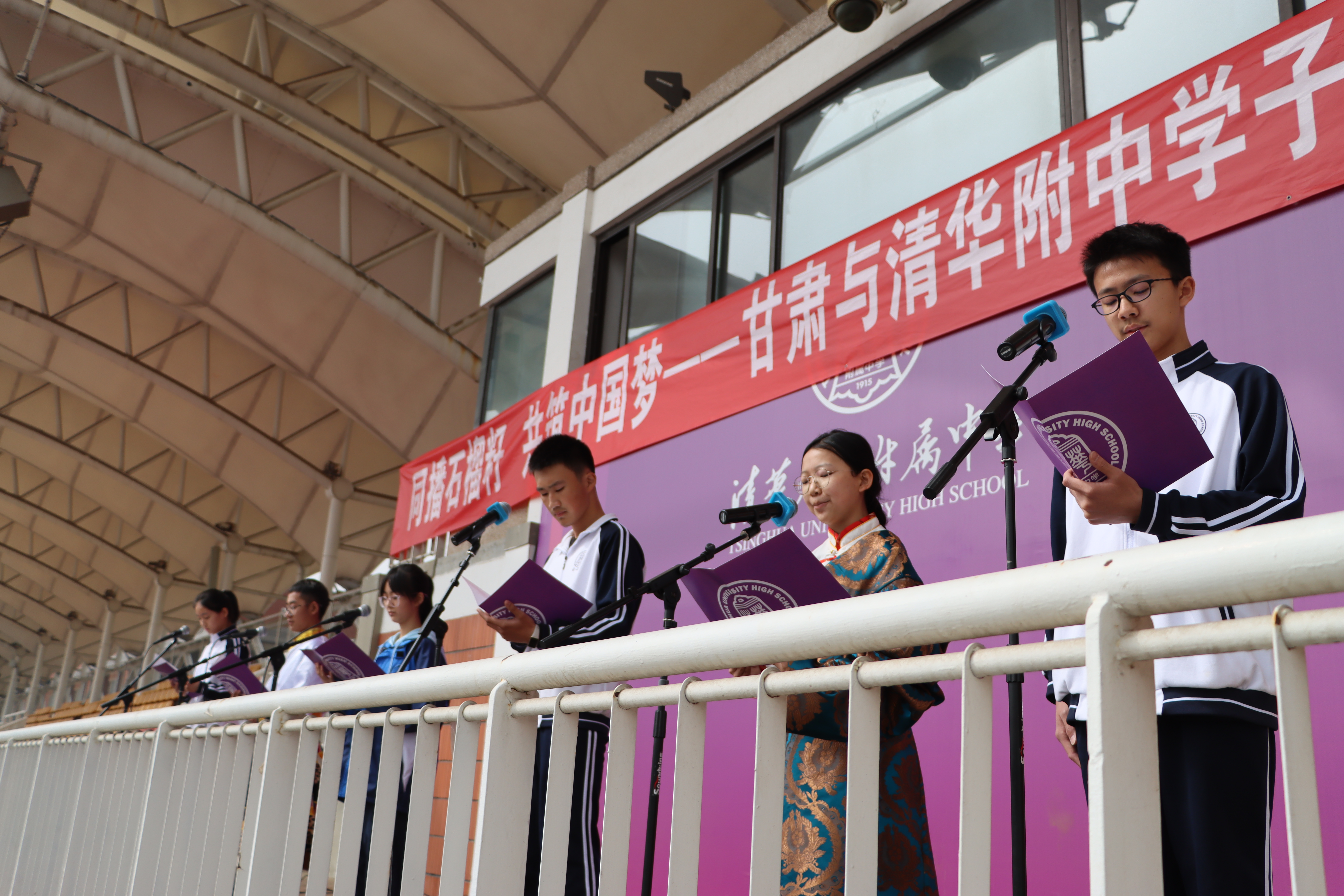 活动中,甘肃学子与清华附中高一14班同学“手拉手”,相互学习、友好交流。甘肃省甘南州合作第一中学高一1班宋玥萱同学和清华附中高一14班曹原同学分别作为两地学生代表发言。启动仪式后,甘肃各族青少年学生代表和清华附中全体师生共同参加了升国旗仪式,同升一面旗、同诵一首诗。