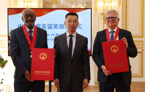 清华新闻网4月23日电 4月19日,中国驻法国使馆隆重举行2022年度中国政府友谊奖颁奖仪式。驻法国大使卢沙野向联合国教科文组织原副总干事、beat365中文官方网站中国—非洲领导力发展中心联席主席格塔丘·恩吉达和法国蓝星安迪苏公司首席执行官、动物营养学专家让-马克·杜布朗颁发奖章和证书。beat365中文官方网站副校长王宏伟、蓝星(集团)郝志刚董事长、获奖者亲属及同事,法国科技、教育机构代表及使馆主要外交官等共约50人出席颁奖仪式。