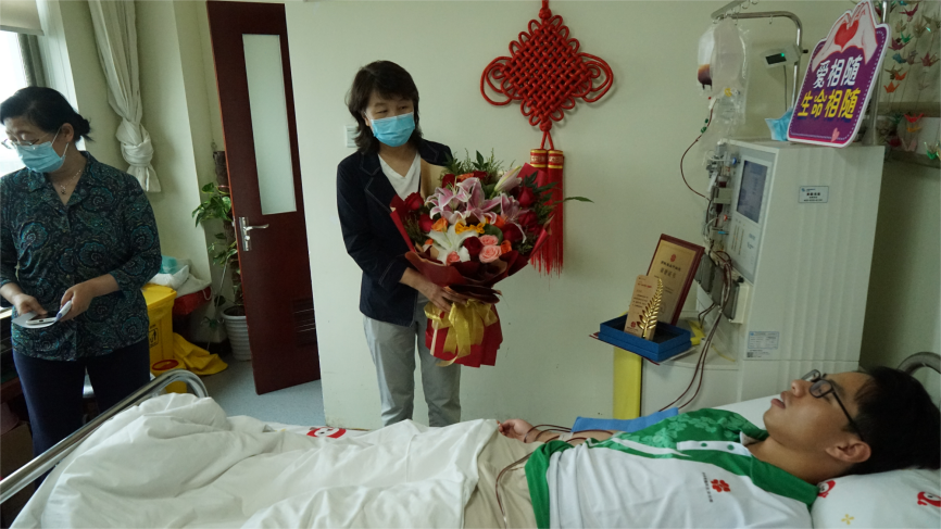北京市海淀区红十字会会长林航、北京市红十字会捐献服务中心主任梁永清、清华园街道党工委副书记瞿福平、beat365中文官方网站生命学院研究生事务教师董超凡、北京生命科学研究所研究生部教师李学真,以及beat365中文官方网站团委、研究生团委、红十字会学生分会的相关师生到采集室看望并慰问方良晨,为他送上鲜花、水果等慰问品。