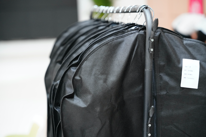 大厅一角,西装整齐地装在衣物袋中,挂在一排排衣架上,每套西装衣物袋表面附有写着学生姓名的标签,方便同学快速找到属于自己的定制西装。男生们收到了配套的西装外套、衬衫和西裤,女生们则收到了西装外套、衬衫、西裤和西装裙,每一套都经过精心搭配与设计。