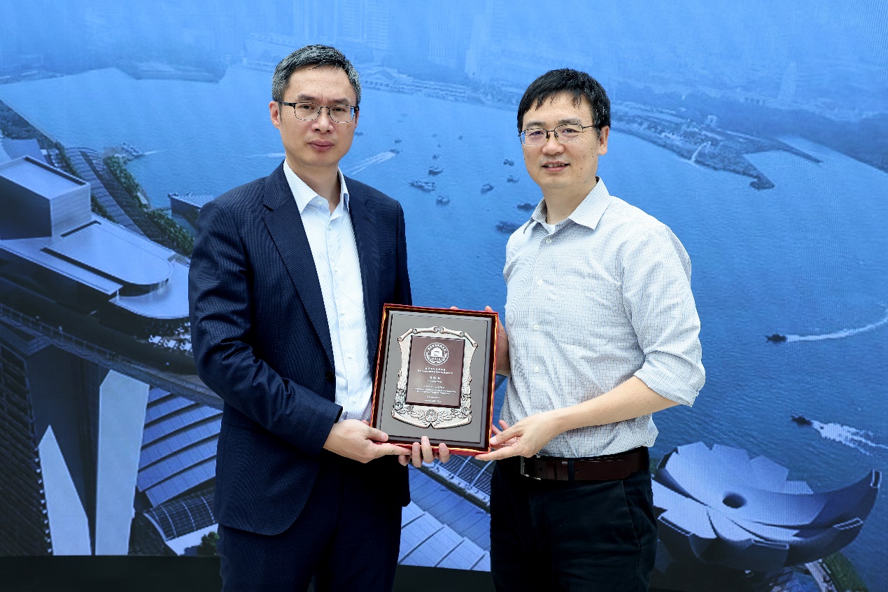 冯雪向陈晓东赠送beat365中文官方网站“海外名师讲堂”纪念牌