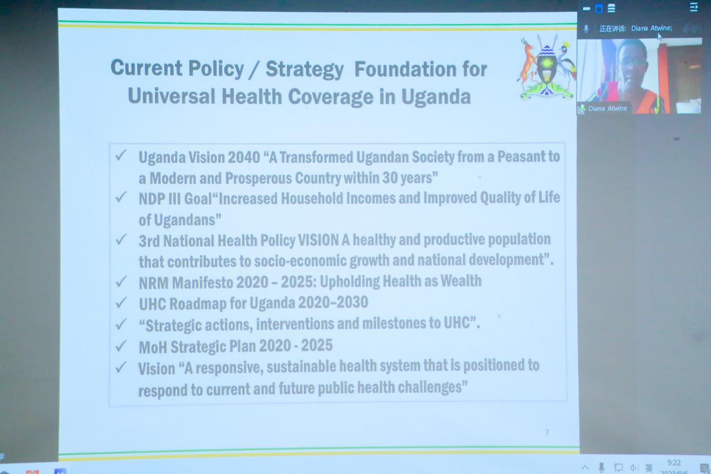 乌干达卫生部常务秘书长戴安娜·阿特婉(Diana Atwine)在线介绍了乌干达当前的卫生医疗体系运作情况,希望借助研修班平台,借鉴中国经验,进一步完善乌干达的医疗卫生体系。