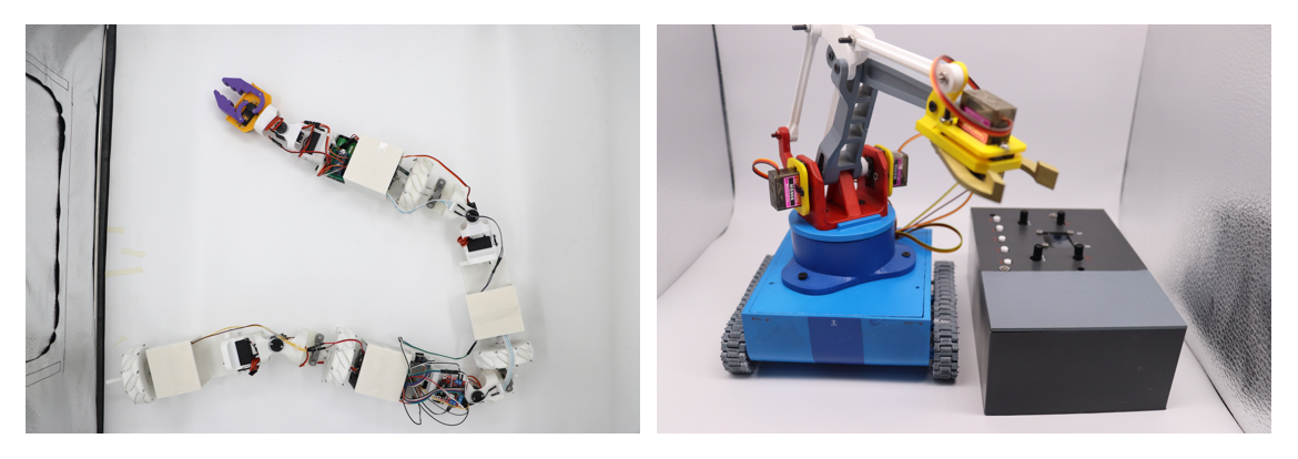 机械设计赛道获奖作品——多功能探索蛇形机器人(左)、机械飞爪(右)