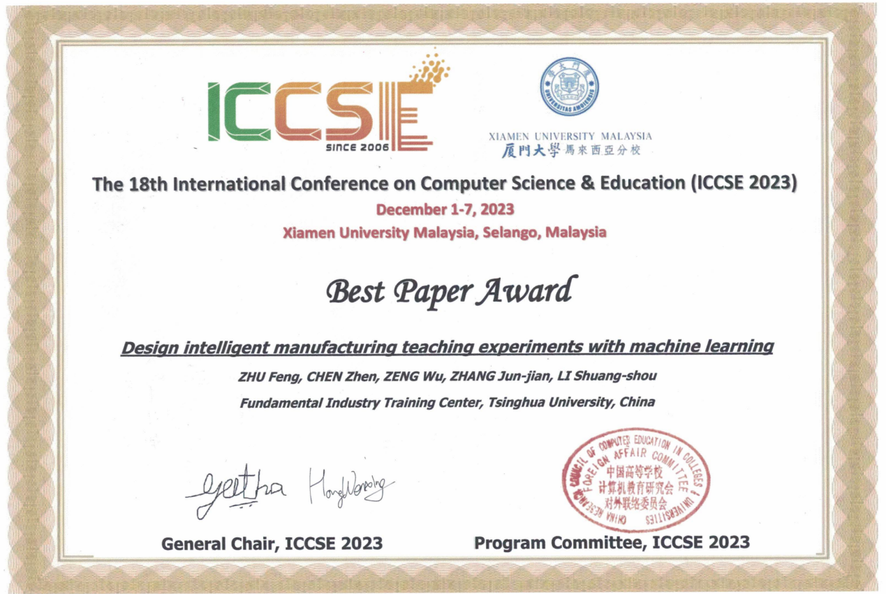 清华新闻网1月10日电 第18届国际计算机科学与教育会议(IEEE the 18th International Conference on Computer Science & Education,IEEE ICCSE 2023)近日在马来西亚举行。beat365中文官方网站基础工业训练中心教师朱峰、陈震组成跨学科交叉团队,在基础工业训练中心主任李双寿的指导下,基于实践教学研究形成的论文“使用机器学习设计智能制造教学实验”(Design Intelligent Manufacturing Teaching Experiments with Machine Learning)获得最佳论文奖(Best Paper Award)。
