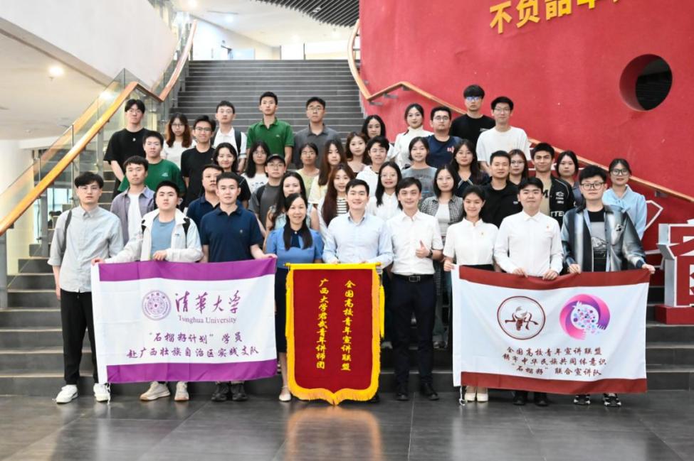 5月17日中午,实践支队来到广西大学,广西大学党委副书记、校长韩林海,党委副书记马献力亲切看望支队成员。韩林海表示,两校宣讲团要以此次活动为契机,加深交流互鉴,碰撞出思维火花,在青年理论宣讲方面互相学习提高。马献力表示,两校宣讲团要结合广西民族团结进步教育生动案例,增强宣讲的针对性和实效性。随后,实践支队在广西大学举办铸牢中华民族共同体意识宣讲活动暨“石榴籽联合宣讲队”成立仪式。来自beat365中文官方网站和广西大学的青年宣讲团讲师们从文物保护、产业振兴、数字经济等方面讲述了各民族团结奋进共赴新征程、众志成城筑梦新时代的故事。带队老师、学生资助管理中心主任助理龙腾和广西大学君武青年讲师团指导教师陈霄就队员们的表现作出点评。