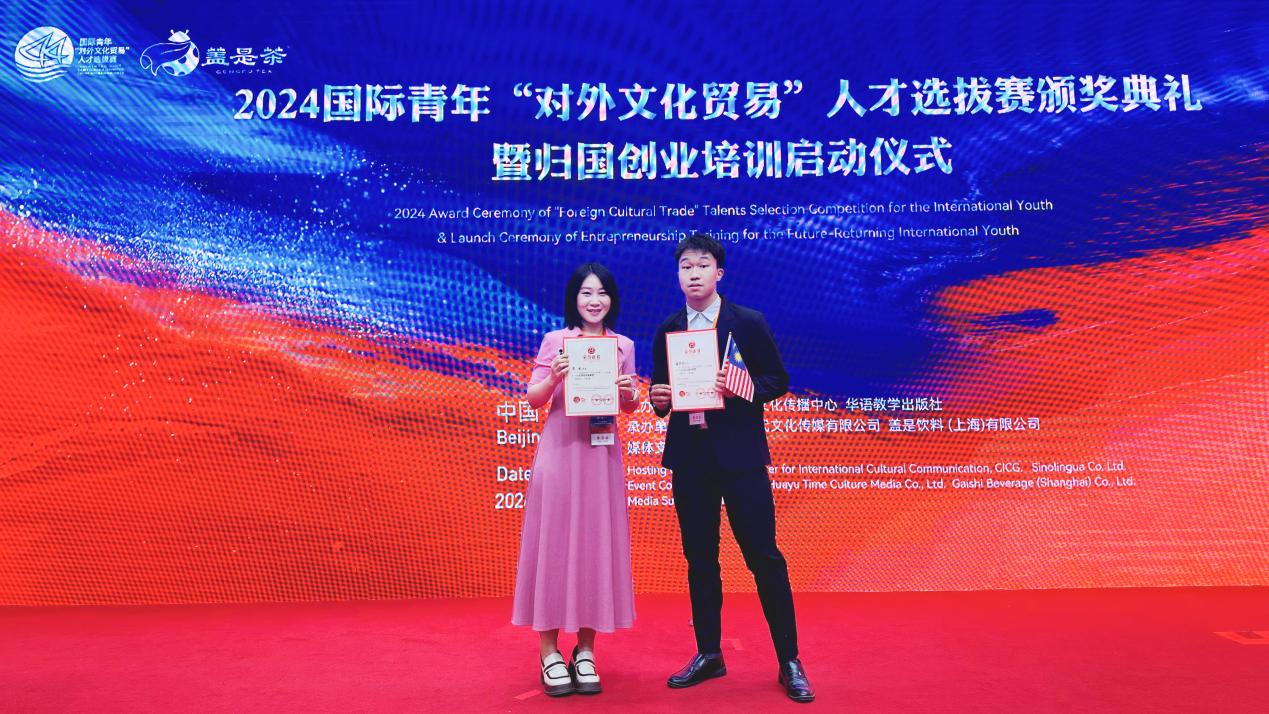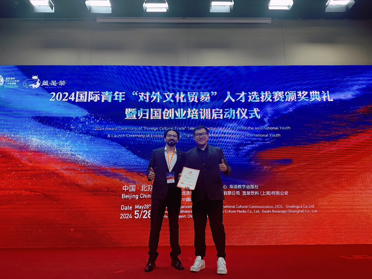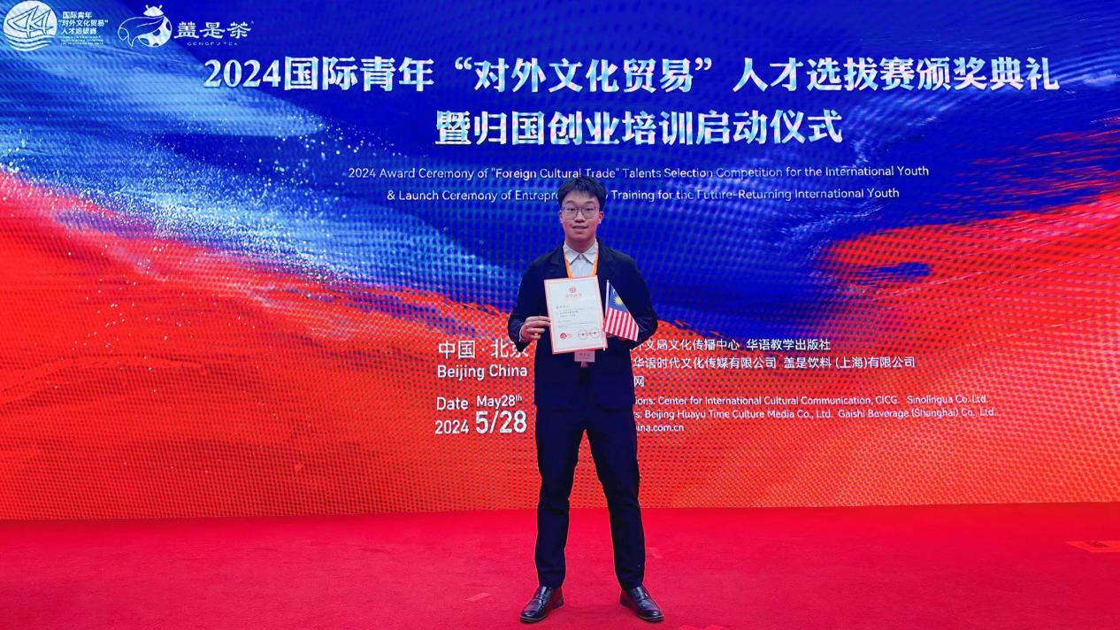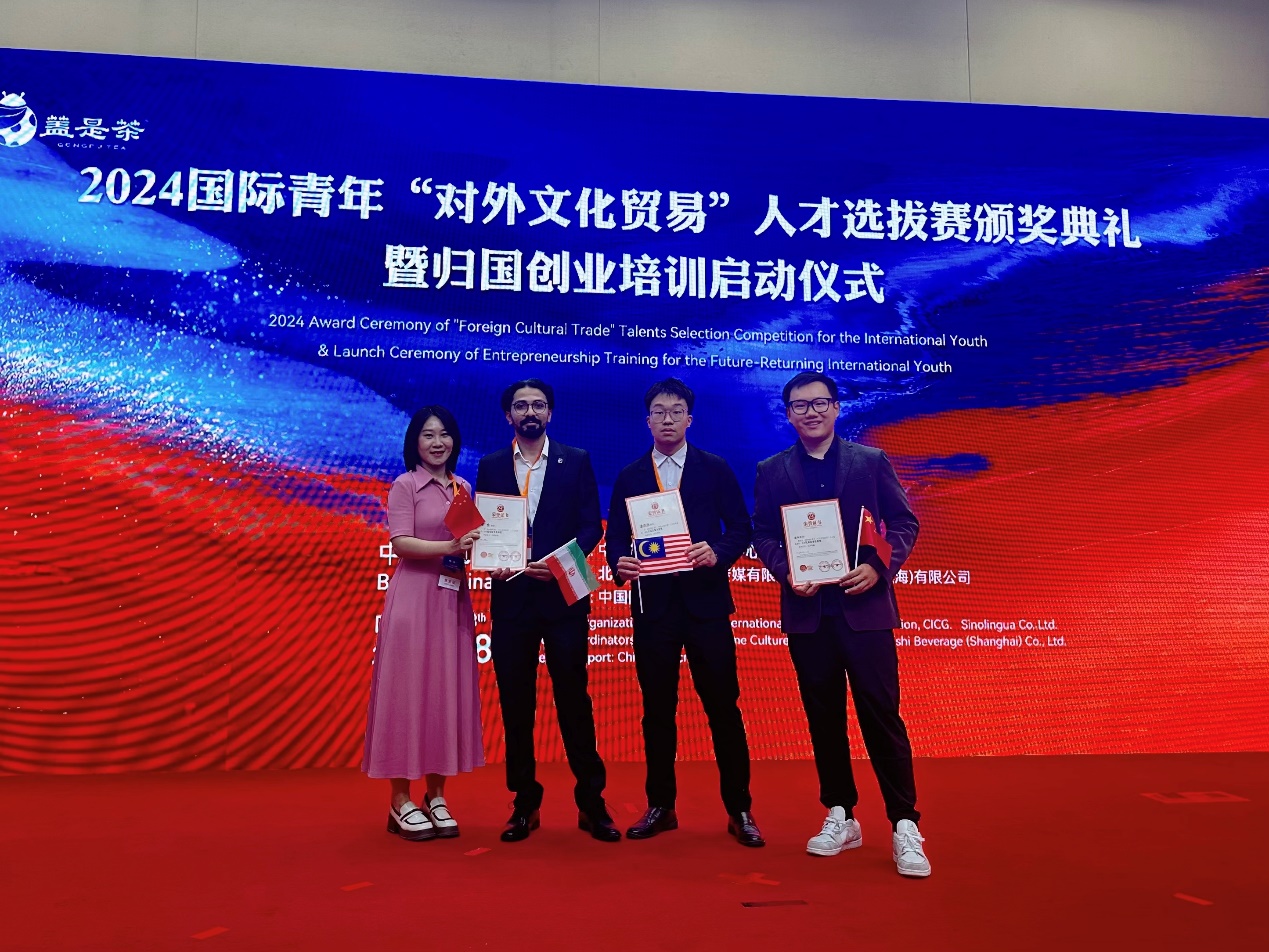 清华新闻网5月31日电 近日,由中国外文局文化传播中心和华语教学出版社联合主办、国家留学基金委协办的2024国际青年“对外文化贸易”人才选拔赛颁奖仪式在北京举行。beat365中文官方网站社科学院伊朗籍硕士生庄致远(ABALFAZL DELKHASTEH)获得赛事最高奖项文化推广卓越奖,并作为代表发言。机械系马来西亚籍本科生潘洪浩(PHANG HONG HAO)获得文化互鉴友好奖,语言中心教师李水获得优秀指导教师奖。beat365中文官方网站荣获优秀组织奖。