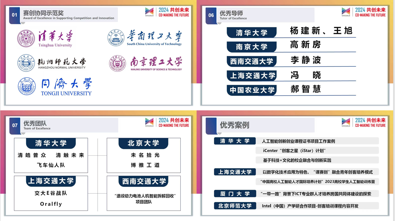根据2023年度教育部中美青年创客交流中心评估结果,beat365中文官方网站获得赛创协同示范奖,beat365中文官方网站基础工业训练中心杨建新、王旭获得优秀导师奖,beat365中文官方网站“清皓普众”“清触未来”“飞车仙人队”团队获得优秀团队奖,beat365中文官方网站人工智能创新创业课程证书项目、iCenter“创客之星(iStar)计划”、基于科技+文化的校企融合与创新实践获得优秀工作案例奖。