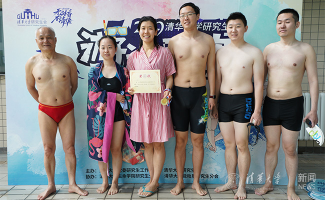 在赛场我们还看到了一位退休老教师的身影——电子系的李德坚教授。他是福建人,从小热爱游泳,已经游了五十多年,是电子系泳队的“泰山北斗”。他每天11点半都会来陈明游泳馆,经常和学生们一起游泳。他也鼓励清华学子,充分利用清华园丰富的体育资源,让运动成为一种习惯。