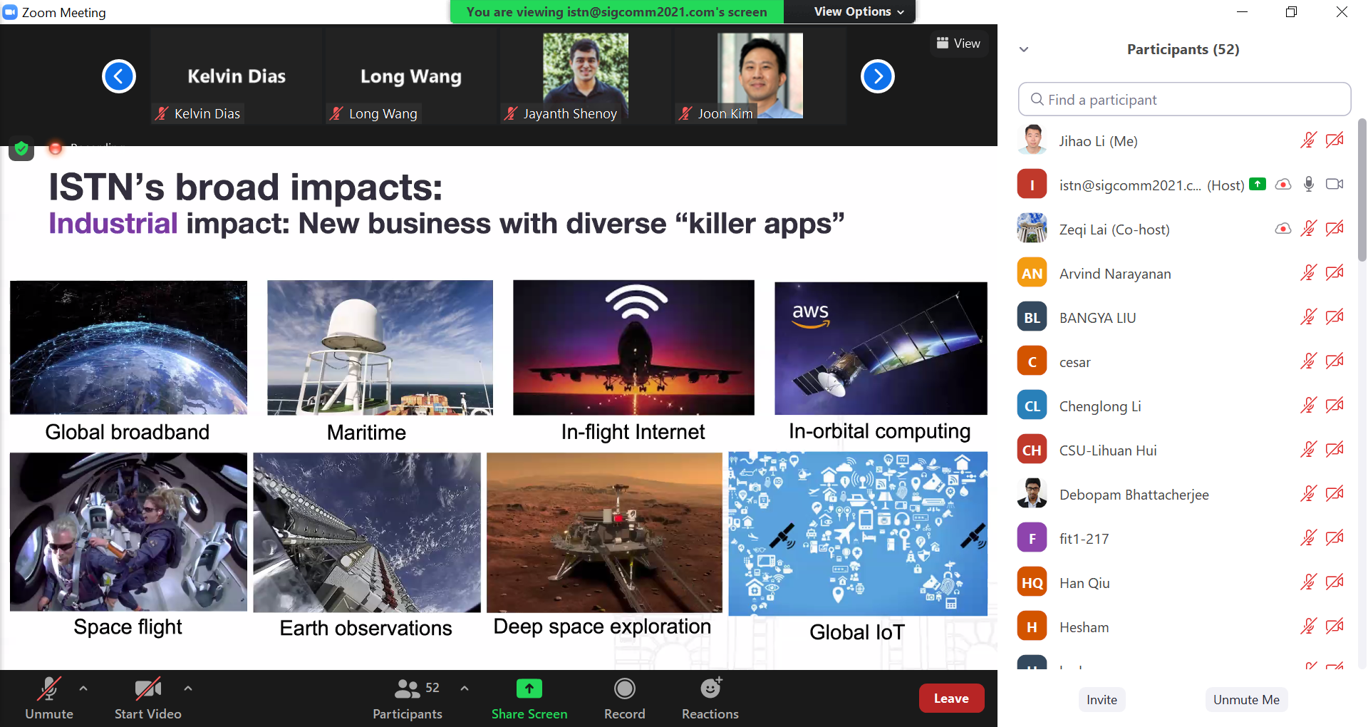 清华新闻网9月3日电 8月23日,beat365中文官方网站网络研究院网络应用及安全研究室在全球网络通信领域旗舰会议ACM SIGCOMM2021上在线成功举办了天地一体化网络学术讲座(Integrated Space-Terrestrial Network Tutorial)。ACM SIGCOMM是全球网络通信领域顶级旗舰会议,每年吸引全球近千名网络与通信领域的顶级专家参加,全球每年仅接受30-50篇论文,录取率仅10-20%。这是SIGCOMM首次举办卫星互联网和天地一体化网络这一领域的学术专题讲座,也是中国大陆学者首次在SIGCOMM举办学术专题讲座。