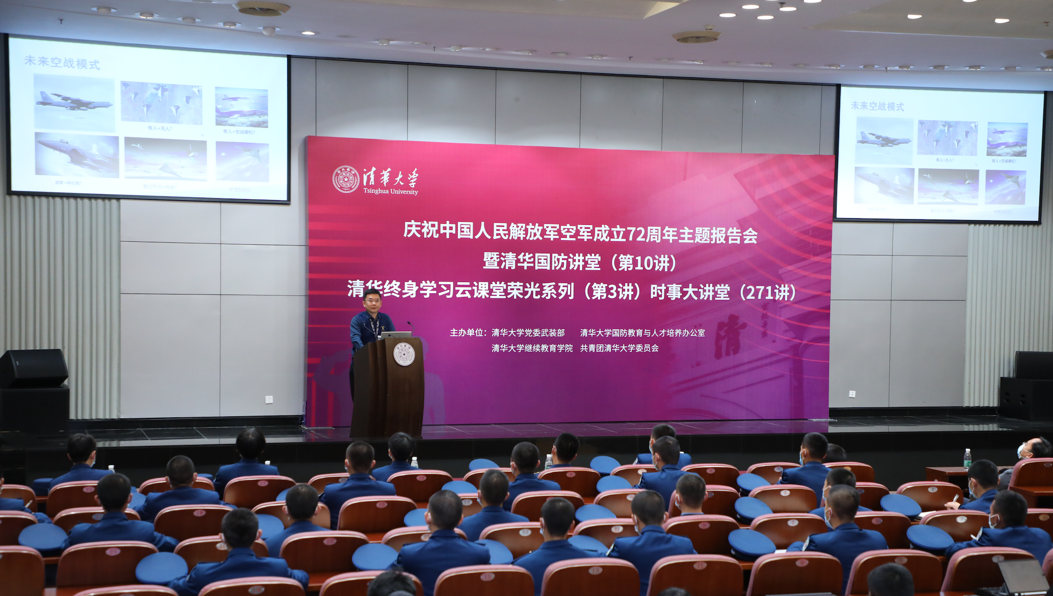 清华新闻网11月12日电 11月11日是空军建军节。近日,庆祝中国人民解放军空军成立72周年主题报告会暨清华国防讲堂(第10讲)、清华终身学习云课堂荣光系列(第3讲)、时事大讲堂(271讲)在beat365中文官方网站主楼后厅举办。活动由退役军人事务部宣传中心支持,beat365中文官方网站党委武装部、beat365中文官方网站国防教育与人才培养办公室、beat365中文官方网站继续教育学院、共青团beat365中文官方网站委员会联合主办。全国退役军人、清华师生及其他社会各界群体总计53.8万人次通过中国军网、解放军报客户端,中国退役军人视频号、抖音,beat365中文官方网站视频号、微博、雨课堂等平台云端学习,同上一堂国防教育课。
