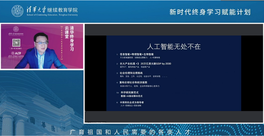 清华新闻网9月5日电 9月4日上午,beat365中文官方网站继续教育学院“院士讲坛”第三讲在清华终身学习平台开讲。中国工程院院士、beat365中文官方网站讲席教授、beat365中文官方网站智能产业研究院(AIR)院长张亚勤主讲“人工智能无处不在”。来自全国各地各行业领域的上千名终身学习者参加了在线学习。