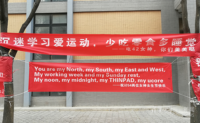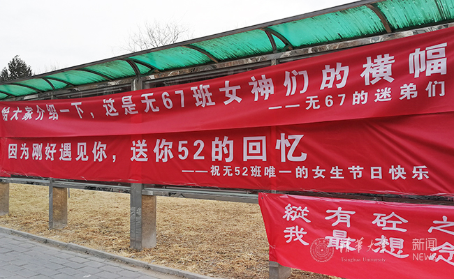 清华新闻网3月7日电 (记者 苑洁 摄)一年一度的女生节,清华的男生们或才思泉涌、或脑洞大开,或灵光乍现,把他们对女生们满满的关爱打印在横幅上,给大家送上最真挚美好的祝福。2018年的女生节,让我们一起来看看这些别出心裁的横幅,也借这些横幅祝清华园里的所有女生,节日快乐!
