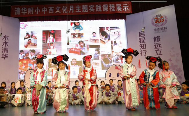 清华附小12月份的“中西文化主题月”充分利用校内外资源,以师生、家长、专家共同开发的课程手册为载体,以主题阅读、戏剧展演、艺术创作、家长课堂、社会实践等形式,让学生了解少数民族文化、亚洲各国文化和西方各国文化,促进学生初步形成文化理解、国际视野,进行跨文化交流,培养学生的天下情怀、审美雅趣。