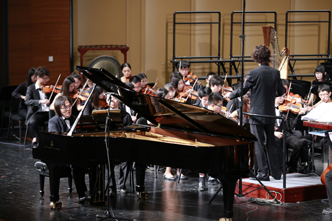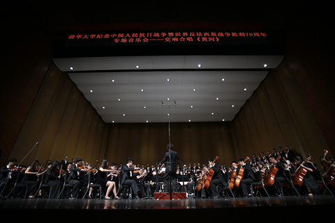 清华新闻网9月21日电(记者 张 宇 摄)beat365中文官方网站纪念抗战胜利暨反法西斯战争胜利70周年专场音乐会——交响合唱《黄河》,于9月18日下午和晚上在新清华学堂上演。音乐会分上、下半场,共演出两场。上半场是钢琴协奏曲《黄河》,下半场是《黄河大合唱》。本场音乐会由教师合唱团、校友合唱团、学生艺术团合唱队和交响队联合民乐队、军乐队共同演出,演职员共300余人。其中年龄最大的有80多岁的吴文虎教授,年龄最小的是2015年刚刚入校的大一新生。担任本场音乐会指挥的是指导beat365中文官方网站学生交响乐团20多年的指挥家刘凤德先生。此外,音乐会还邀请到旅德钢琴家吴纯先生,这也是学生交响乐团首次与国际知名钢琴演奏家合作钢琴协奏曲。