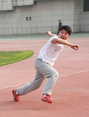 图为男子垒球掷远比赛选手掷出球后的瞬间。