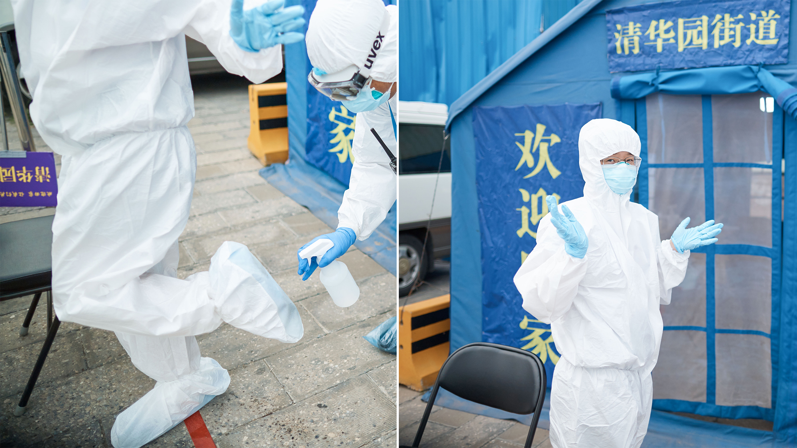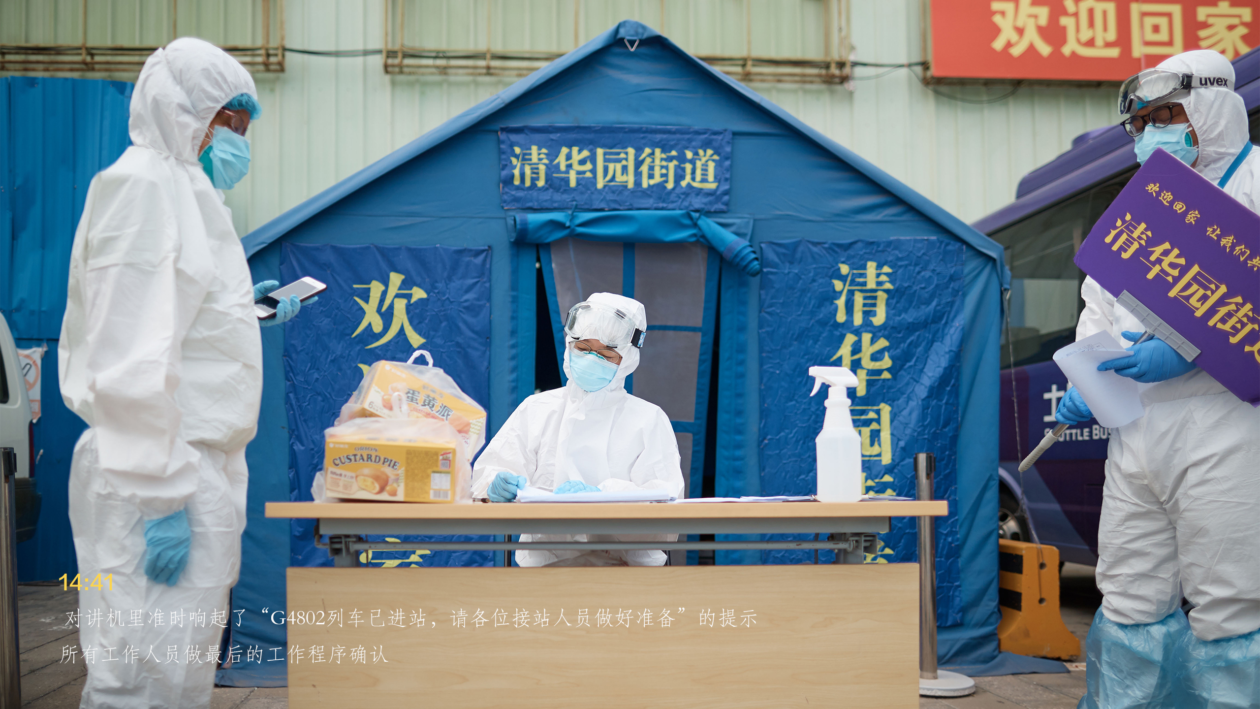 从抵达接站点到踏上回家的车,所有手续办理仅仅用了12分钟。像这样的流程每天要进行四遍,一直要持续到晚上十点。为了节省物资,接站人员只能一直这样穿着防护服等待返京人员的到来。大家明白,从湖北回来的乘客们经受着旅途劳顿和防疫工作的双重压力,心情难免有些不安,而我们唯一能做的就是将所有的办理程序以最有效的方式完成,尽快让返京人员踏上回家的校车。为了一份安心,所有工作人员穿着厚厚的防护服一次次地演练,里面都浸透了辛勤的汗水。