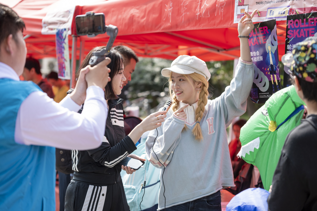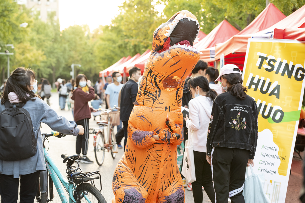 受疫情影响,部分国际学生尚无法返校。因此,今年的联合招新采取了线上、线下相结合的新模式,新增了线上直播环节,通过“雨课堂”直播平台,让远在异地的同学也能身临其境般地感受到清华独特的社团文化。同时,根据疫情防控要求,线下现场的社团展位采用“间隔式”布局,工作人员也在主场区引导师生保持社交距离、提醒佩戴口罩。