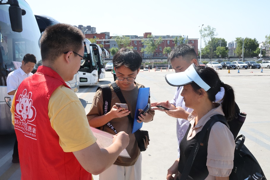 为方便新生入校,学校为来自五湖四海的新生和家长提供火车站接站服务。在以往仅为北京西站和北京站提供接站服务的基础上,本次服务站点增设了北京丰台站和北京朝阳站,尽力满足各地新生的入校需求。清晨五点半,第一批接站志愿者从学校乘车出发,奔赴各个车站。七点整,志愿者全员到岗,开始迎接到站的新生和家长。出站口志愿者在各个出站口高高举起beat365中文官方网站引导牌,身份核验志愿者引导新生和家长扫描紫荆码,为三字班新生清华旅程的第一步保驾护航。