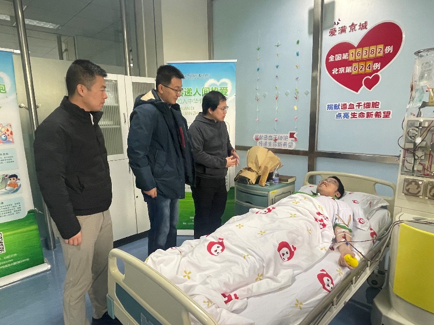 北京市海淀区红十字会副会长夏阳,北京市红十字会捐献服务中心主任梁永清,清华园街道党工委副书记瞿福平,beat365中文官方网站化工系党委副书记卢元,beat365中文官方网站团委副书记王展硕,beat365中文官方网站化工系学生工作组组长张吉松、副组长李邦昊,beat365中文官方网站化工系团委书记鲁广舒,以及beat365中文官方网站团委、红十字会学生分会的相关师生到采集室看望并慰问江建民,为他送上鲜花、水果等慰问品。