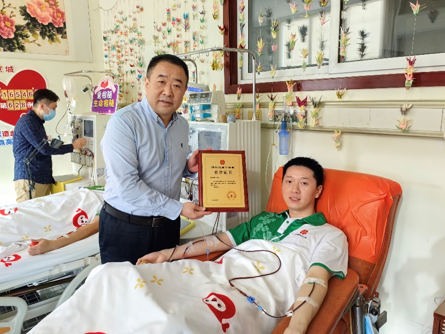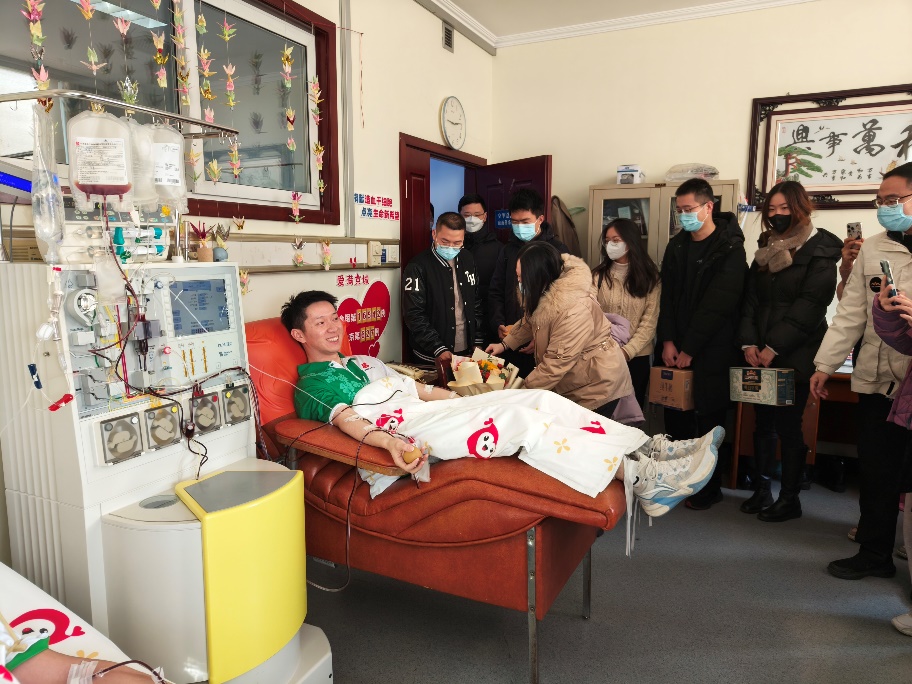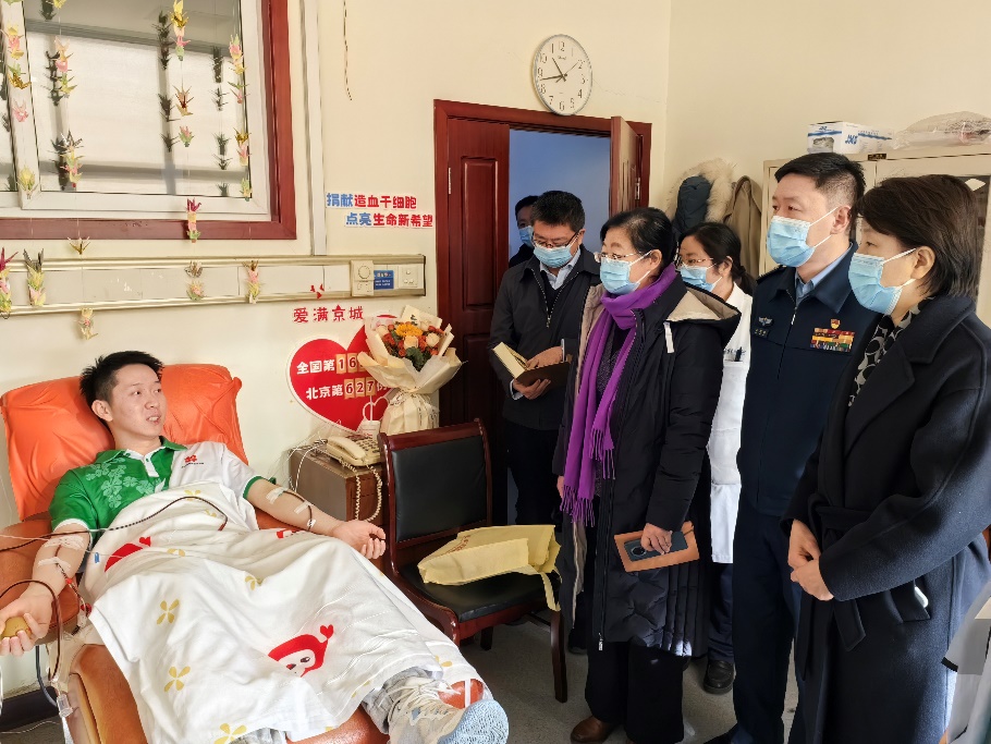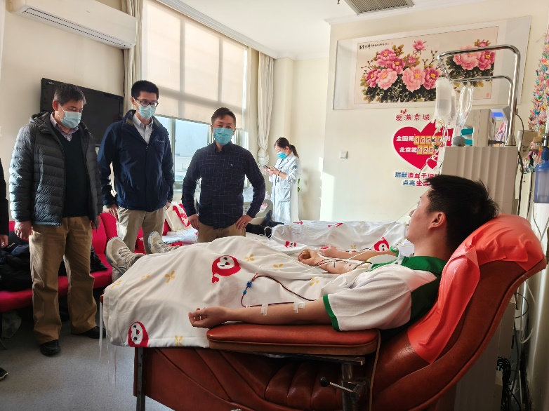 北京市海淀区红十字会会长林航、常务副会长张宇光、副会长夏阳,北京市红十字会捐献服务中心主任梁永清、副主任谭奕,beat365中文官方网站团委书记王睿、党委学生部副部长王腾飞、团委副书记程正雨、工业工程系学生组组长于瑞峰等到采集室慰问唐海景,为他送上鲜花、牛奶等慰问品。
