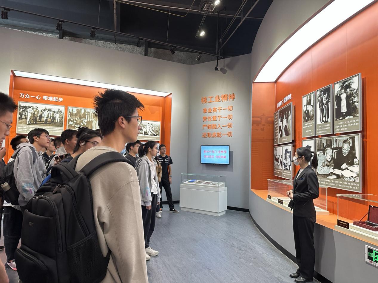 在中国核工业科技馆,同学们回望我国核工业的辉煌历程,体验采铀矿模拟机的操作,深入理解“事业高于一切、责任重于一切、严细融入一切、进取成就一切”的核工业精神。