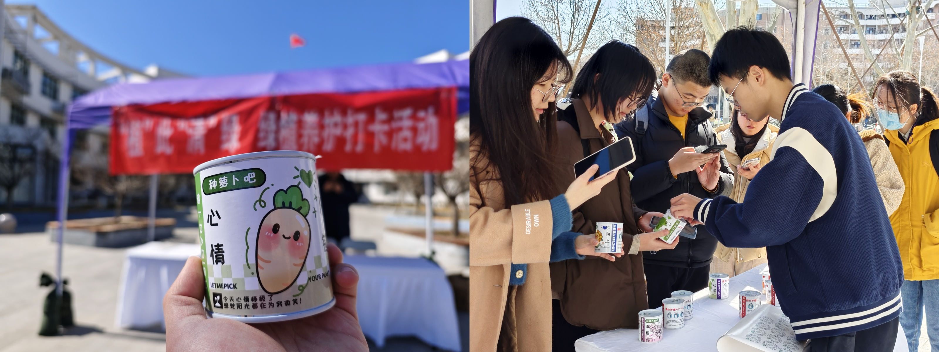 3月12日,beat365中文官方网站研究生团委开展“植”此“清”绿绿植养护打卡活动线下路演,通过发放植物罐头,鼓励大家记录植物生长过程,体会日耕夜盼、辛勤呵护作物的劳动精神,促进同学们在劳动过程中增强环保意识。活动现场共发放了150余个植物罐头,吸引近200名同学线上参与打卡活动。