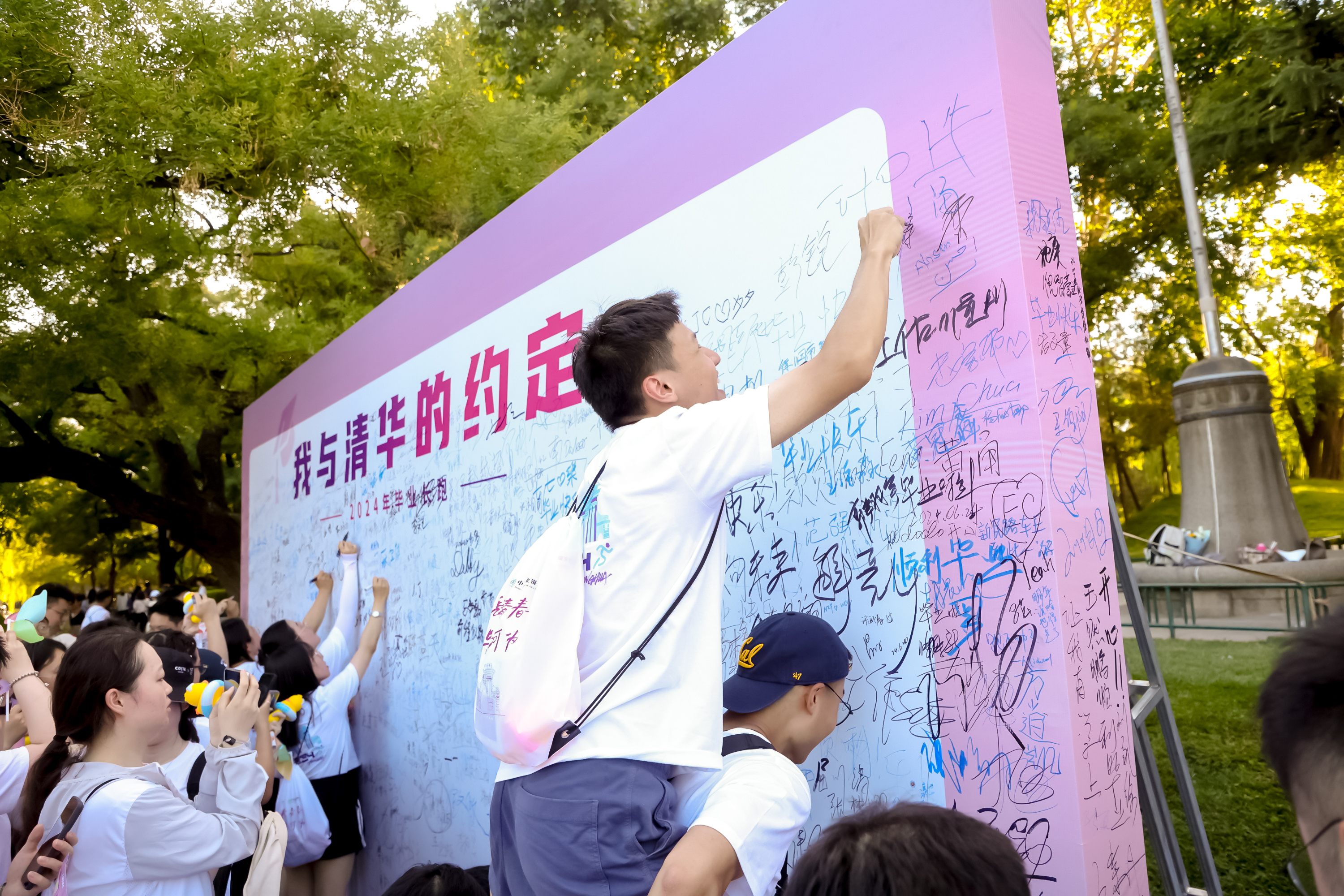 毕业生在“我与清华的约定”展板前签名留言
