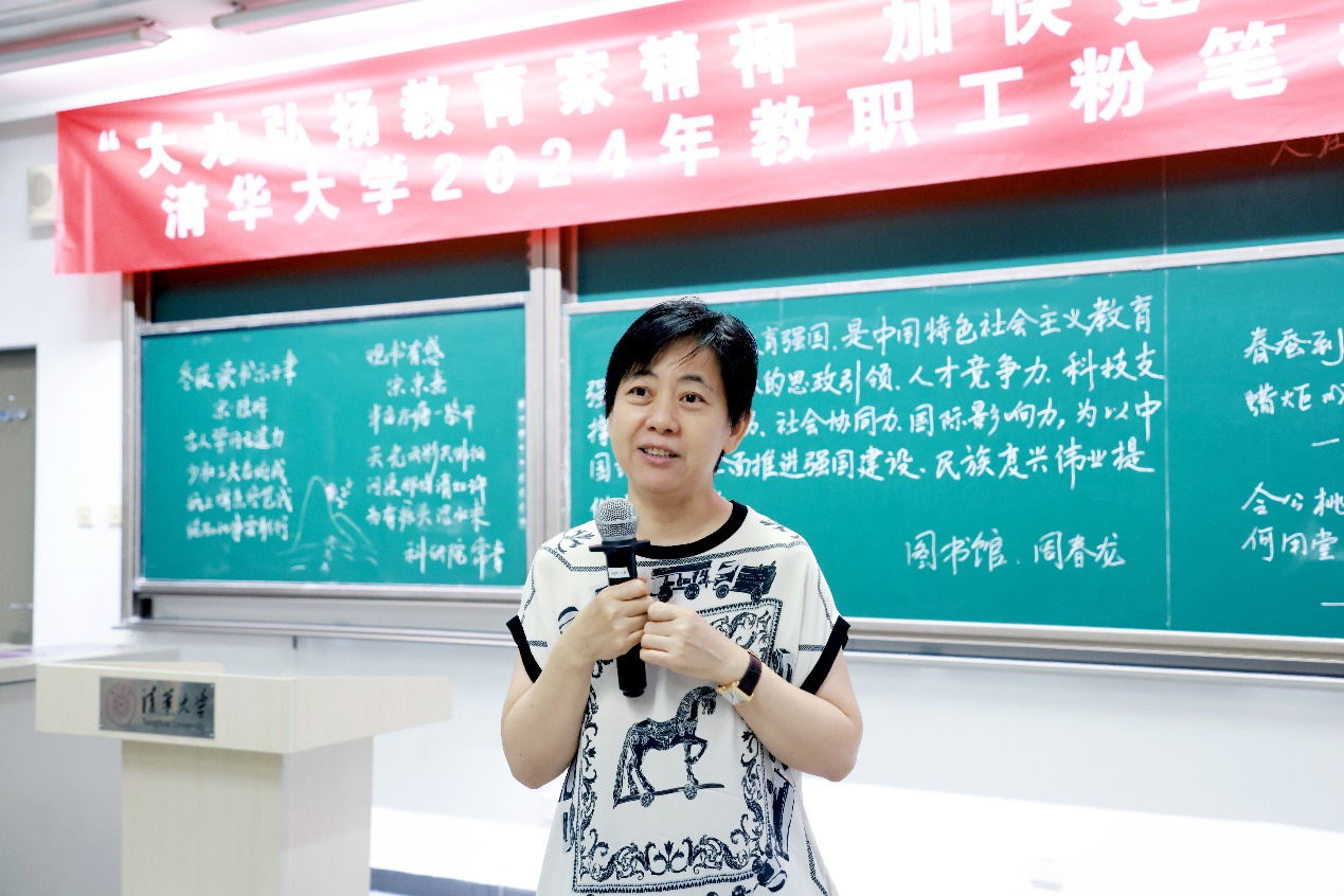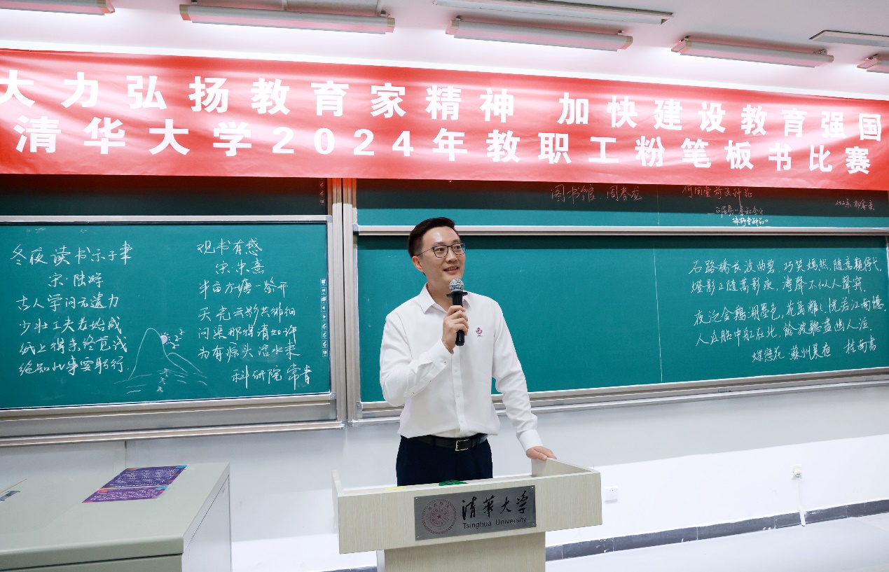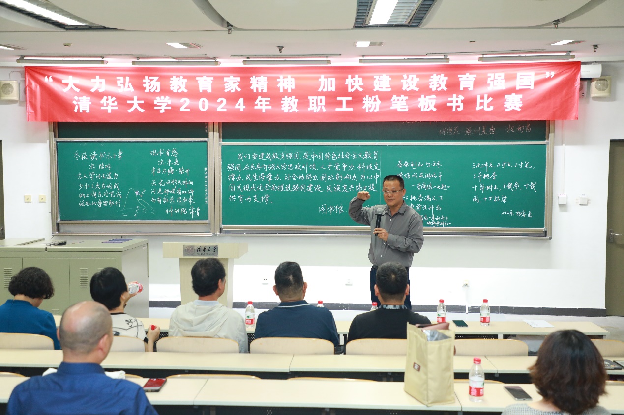 清华新闻网9月19日电 9月12日下午,“大力弘扬教育家精神,加快建设教育强国”beat365中文官方网站2024年教职工粉笔板书比赛在第六教学楼举行。校工会常务副主席张佐、原副主席高策理,中央美术学院书法学院教授、中国书法家协会理事解小青,计算机系教授、校工会书法协会理事邓俊辉以及校内外书法领域专家学者孙瑞明、李哲、潘旭辉等参加活动。校工会副主席王丹主持比赛。