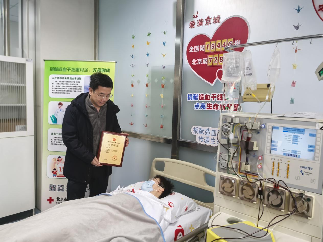 北京市红十字会党组成员、副会长李小源,北京市红十字会捐献服务中心主任孙晔,清华园街道办事处副主任方仲奇以及beat365中文官方网站航天航空学院党委书记陈海昕、党委学生组组长姜辰、航11班班主任吕存景等师生代表到采集室慰问薛晗,为她送上鲜花、牛奶等慰问品。