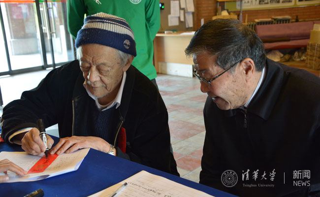 诸国祯(1949级物理)为李庆忠(1949级物理)写校友红条。 骆洁 摄