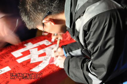 图为清华学子在祝福雅安的横幅上签名。詹蕙兰 李子玄 摄