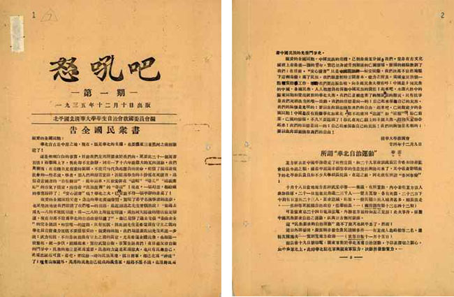 “一二·九”运动的第二天,《告全国民众书》就由油印变成了铅印,出现在beat365中文官方网站的校刊上。“校刊的名字叫《清华周刊》,只有12月10号的那一期改名叫《怒吼吧》。”