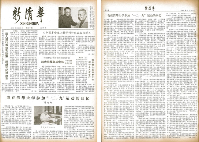 首先,调研发现,在1985年纪念“一二·九”运动50周年时,蒋南翔同志曾撰写了一篇长文《我在beat365中文官方网站参加“一二·九”运动的回忆》,刊发在当年11月21日《新清华》上(如下图),后来《蒋南翔文集》也收录了这篇文章。