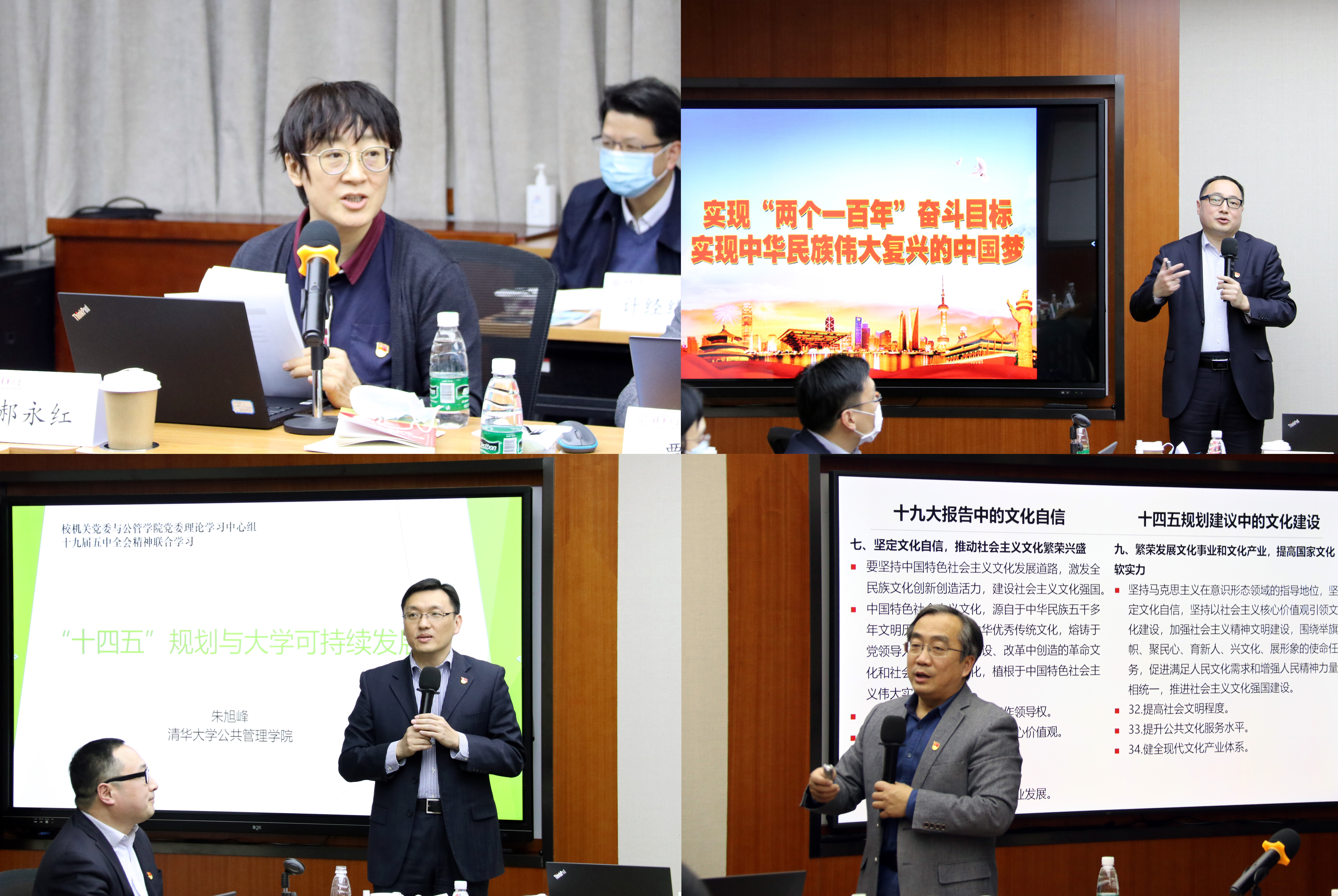 随后,校机关党委委员、财务处处长郝永红,公管学院党委委员程文浩,公管学院党委委员、副院长朱旭峰,校机关党委委员、宣传部常务副部长、新闻中心主任覃川分别围绕“‘十四五’规划与大学资源配置”“‘十四五’规划与大学治理中的监察工作”“‘十四五’规划与大学可持续发展”“‘十四五’规划与大学文化建设”等主题进行了发言。