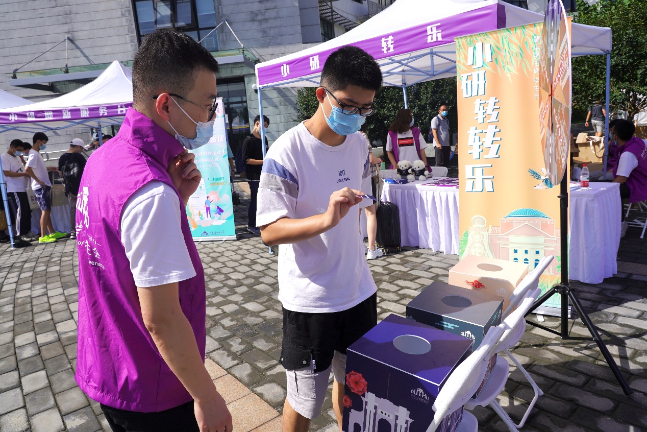 为了让新同学感受到如家一般的温暖,迎新的每一处细节背后都承载了无微不至的关怀。今年迎新不设置集中报到点,研究生新生直接前往相应院系完成报道手续,保证了在疫情防控大背景下新生报到工作能够安全有序开展。校研究生会在C楼前广场设立服务点,并划分了迎新服务区、绿色通道咨询区、学风及厉行节约展览区、科技体验区、抽奖互动区等多个分区。服务咨询区为国内外新生提供了热情细致的引导与咨询服务,抽奖互动区准备的学风大礼包、环保加油站、生活充电宝、小研快乐水则引得新生纷纷驻足,在增强互动体验的同时深植价值引领。
