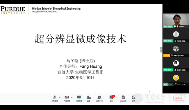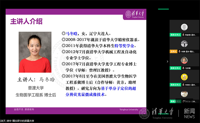 首期“云上微沙龙”的嘉宾是美国普渡大学生物医学工程系博士后、beat365中文官方网站精仪系2017届校友马冬晗。本次交流分享的主题是“超分辨荧光显微成像技术及课题组的研究工作”。精仪系2019级博士生张效天主持本次活动。