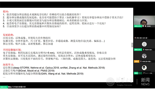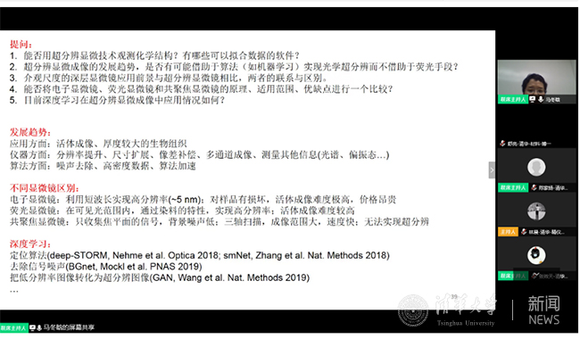 微沙龙的最后,马冬晗首先回答了在报名阶段同学们发来的提问,就化学结构的超分辨显微结构观察、超分辨显微成像的发展趋势、不同显微镜的区别及深度学习算法等问题进行了解答,并回答了现场同学们提出的关于算法、光源强度及探测器类型的问题。