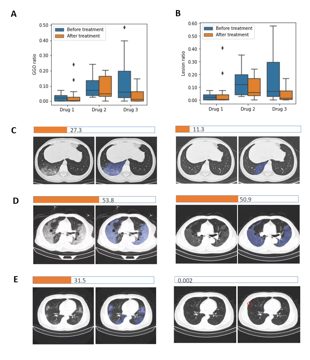 此外,通过医生手工标注的四千余张CT影像的典型病灶,系统可以对新冠肺炎、其他病毒性肺炎及细菌性肺炎的五类典型病灶(磨玻璃影、实变、空腔空洞等)自动进行精准定位,通过精准分析每一个病灶的大小和变化,可以作为药物筛选检测临床试验的判别标准。