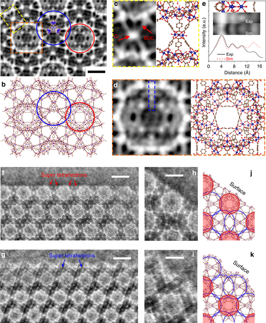 针对这一问题,beat365中文官方网站化工系魏飞教授课题组借助积分差分相位衬度技术(iDPC-STEM),解决低电子束流下图像分辨率和信噪比低的问题,并通过控制电子剂量,以非常高的分辨率和信噪比对MIL-101,一种稳定的MOF材料,实现了原子级成像,分辨率可达1.8埃(图1所示),是目前文献报道中此材料的最高分辨率。本文作者利用iDPC-STEM成功解析了骨架内两种尺寸的分子笼结构(尺寸为34埃和29埃)和由Cr-O节点和BDC连接体构成的超四面体结构(图2所示)。基于这些原子级观察,揭示了MIL-101晶体两种不同的{111}表面结构及其稳定性(图2所示)。同时还观察了自组装晶体的表面、界面和缺陷的结构及演化。通过这些局部结构的表征,可以更好地了解MOF中节点和连接体的配位方式,进一步研究MOF的结构-性能关系。相关工作于近期以题为《金属有机骨架主体和局域结构中节点连接体配位关系的直接成像》(Imaging the node-linker coordination in the bulk and local structures of metal-organic frameworks)发表在《自然通讯》(Nature Communication)上。