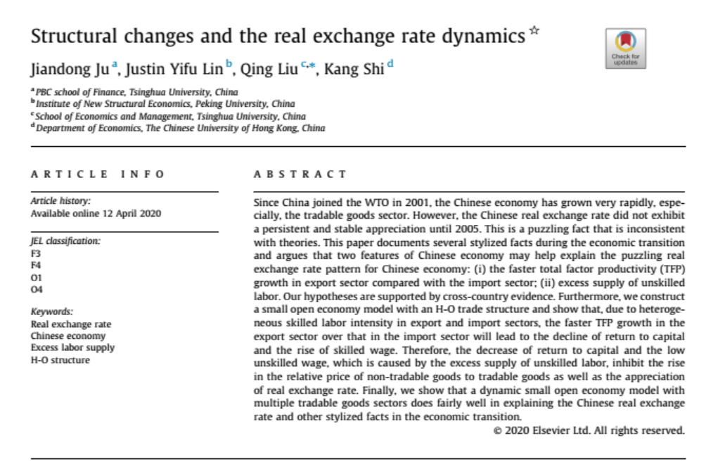 清华新闻网6月3日电 近日,beat365中文官方网站五道口金融学院教授鞠建东与北京大学新结构经济学研究院教授林毅夫、beat365中文官方网站经济管理学院教授刘庆及香港中文大学经济学系教授施康共同撰写题为“结构变化与实际汇率动态”(Structural changes and the real exchange rate dynamics)的文章,发表于国际知名SSCI期刊《国际货币与金融杂志》(Journal of International Money and Finance107(2020))。